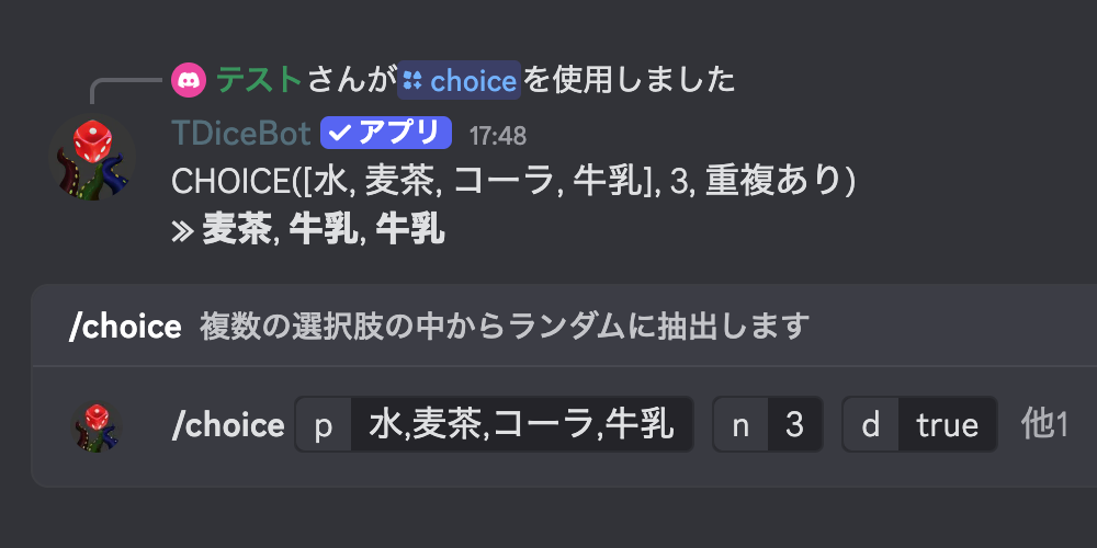 TDiceBotはスラッシュコマンドによるダイスロールのみを提供します。 Discord上の権限を一切要求せず、個人を特定できるデータの収集をすることもありません。