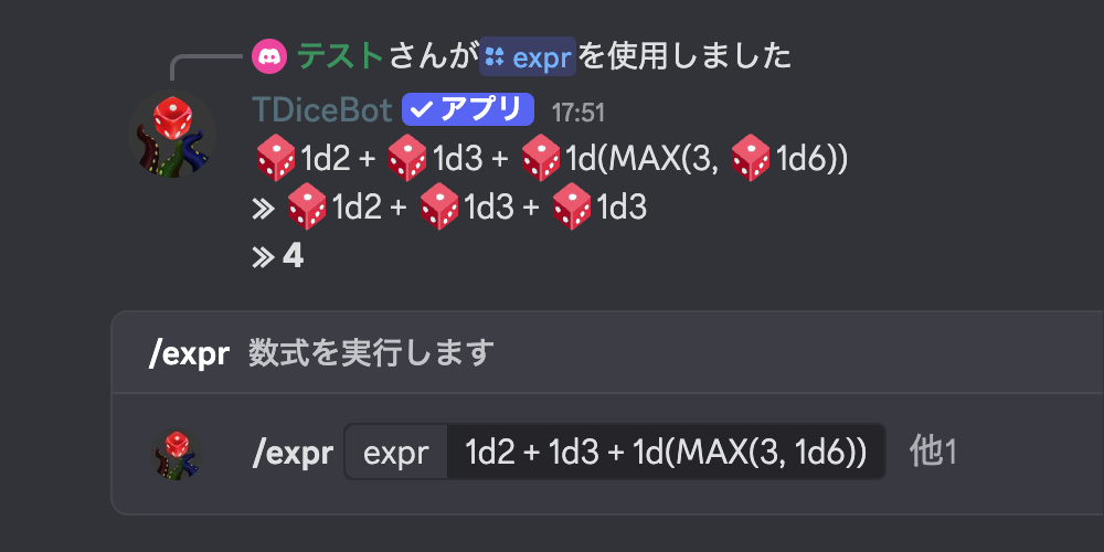 ロール内で数式といくつかの関数が使えます。四則演算はもちろん、実数にも対応しています。 ダイス内に再帰的に数式を入れることもできるので、柔軟なダイスロールを実現できます。